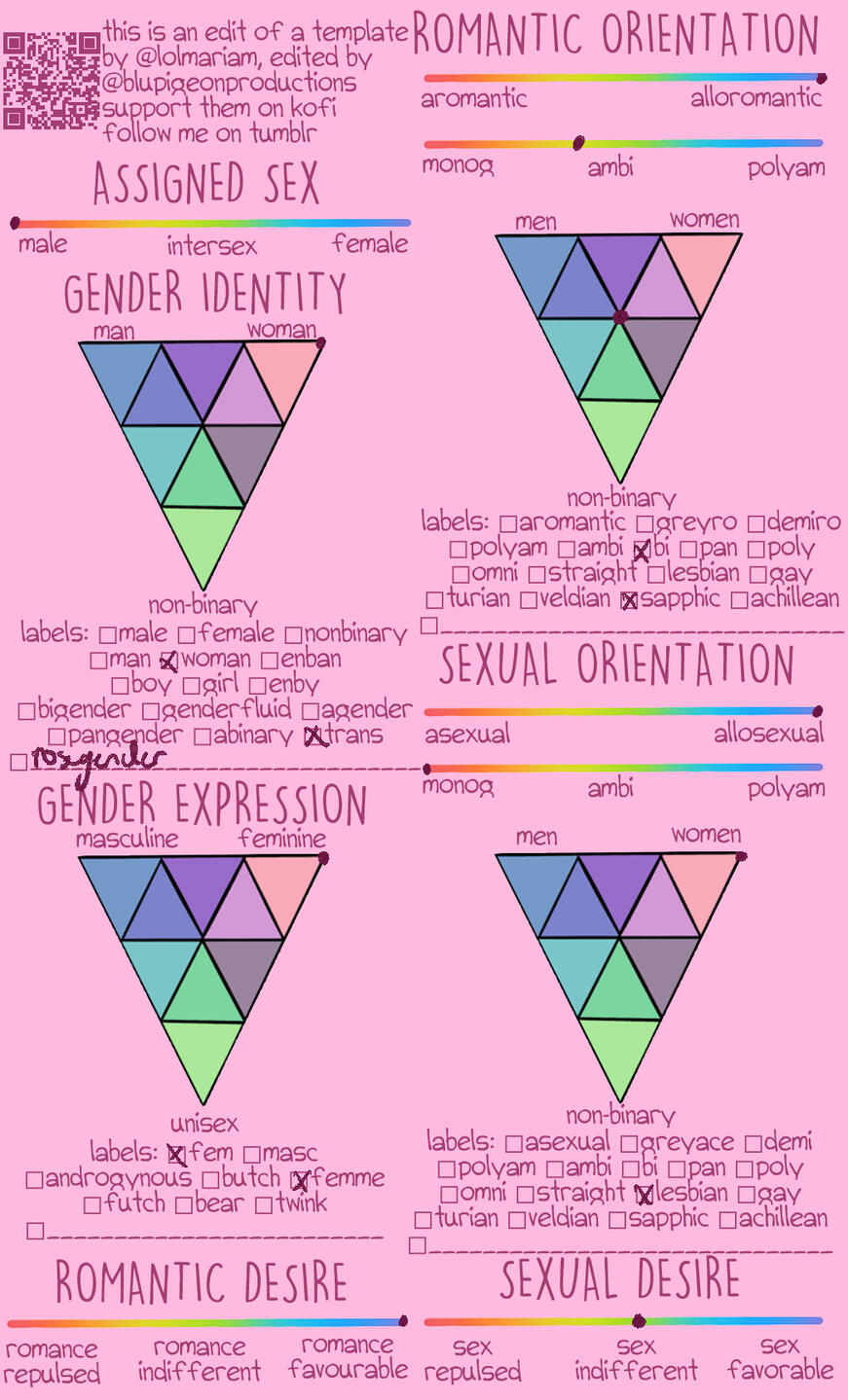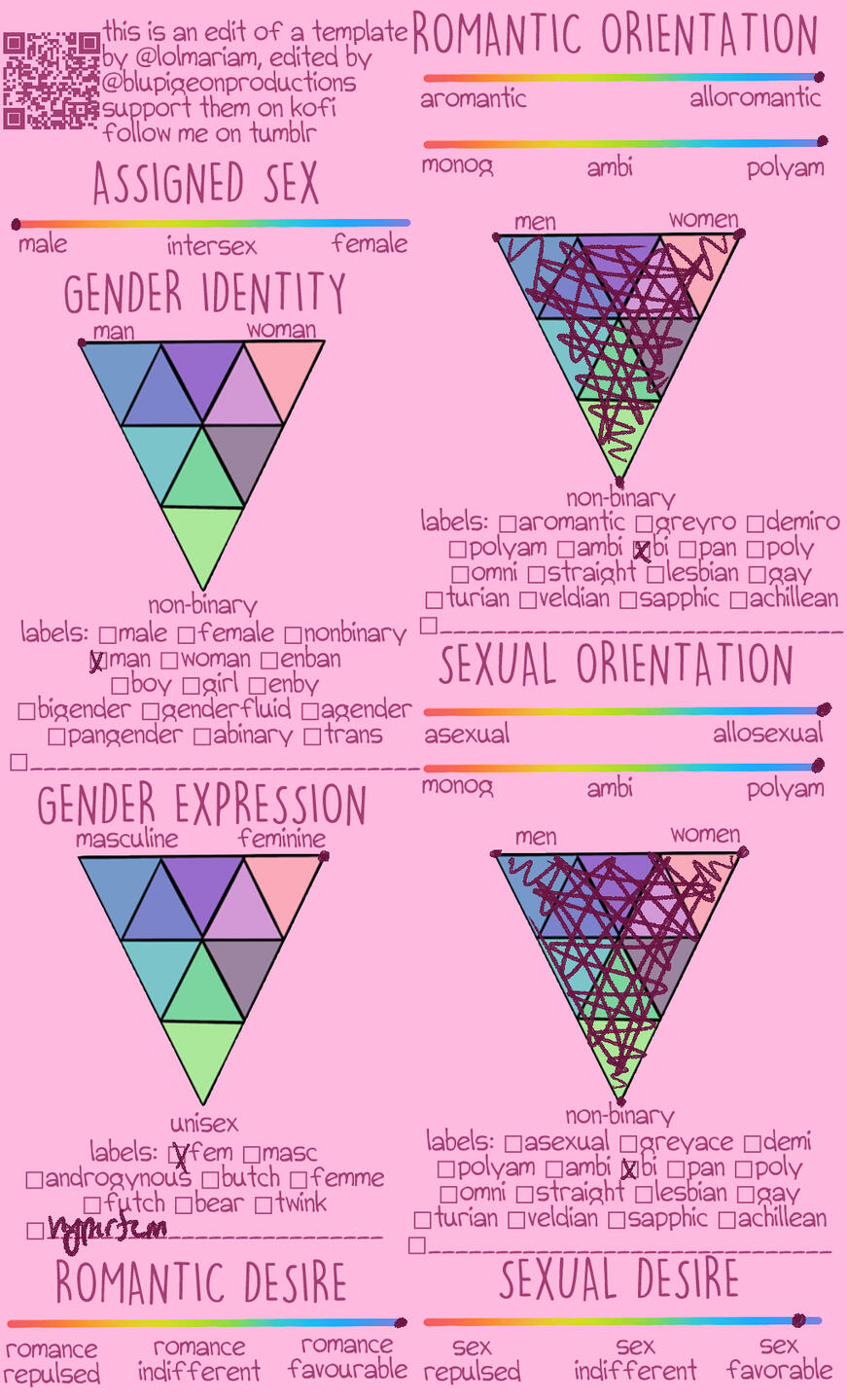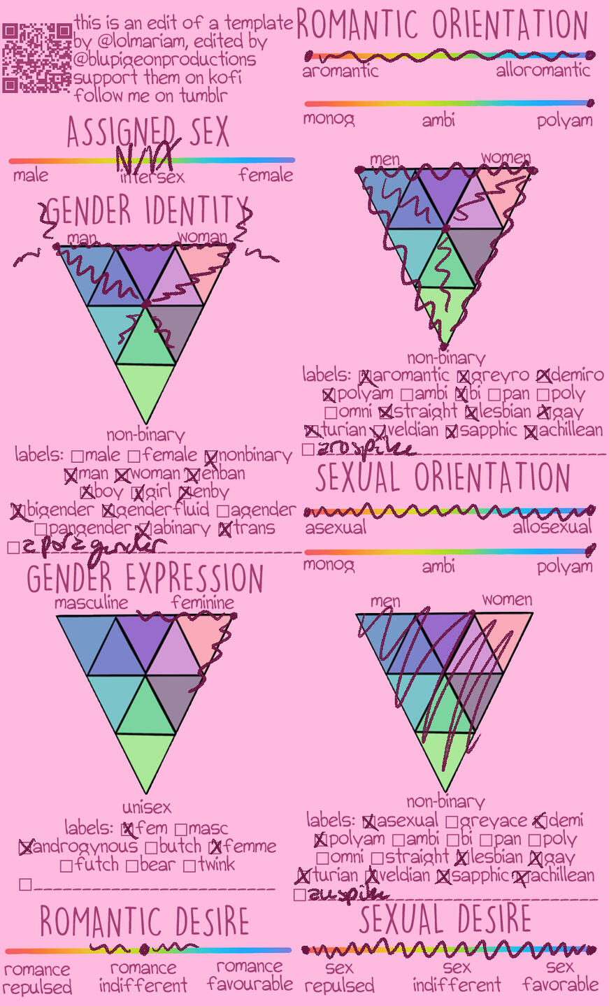 bigender, nonbinary, oriented aroace, abrosexual, polyamorous, pink lesbian, blue gay