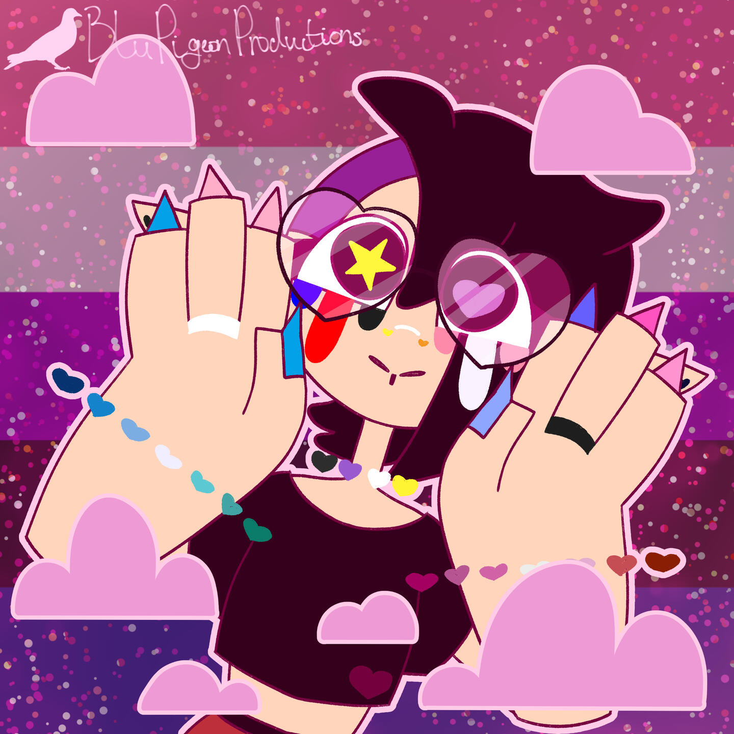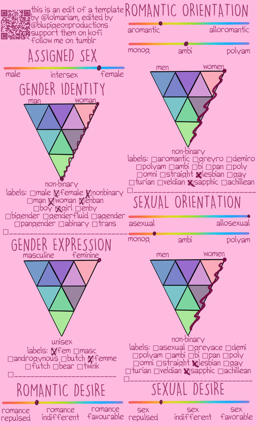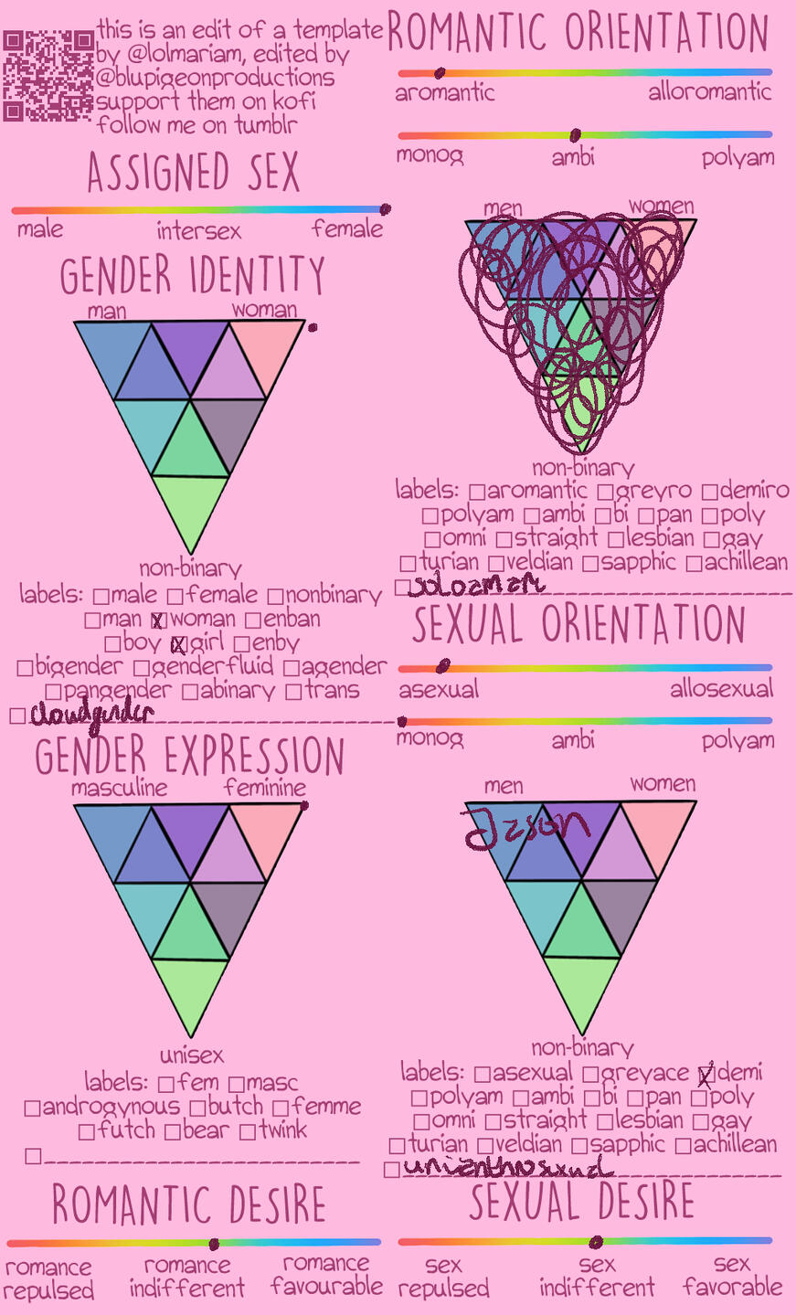 bigender, nonbinary, oriented aroace, abrosexual, polyamorous, pink lesbian, blue gay