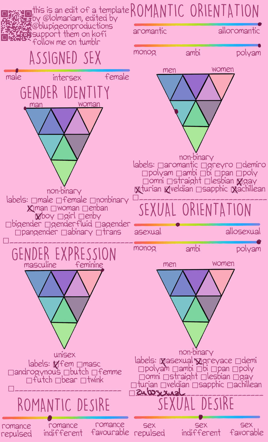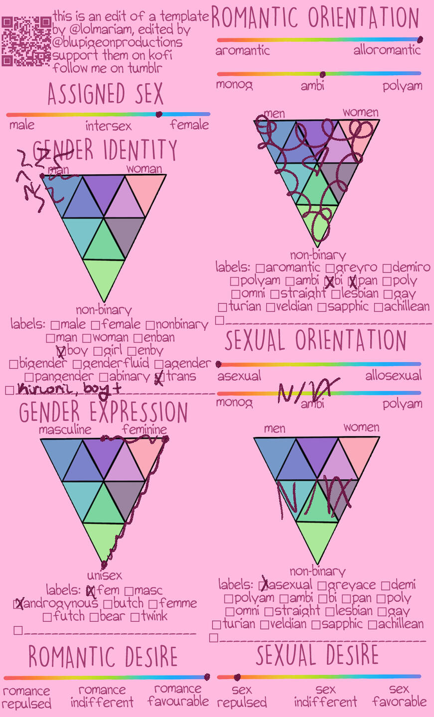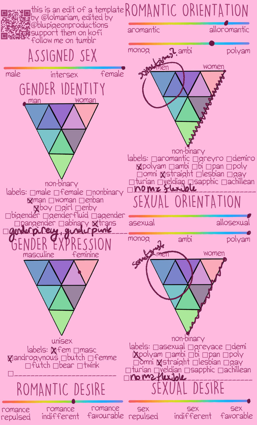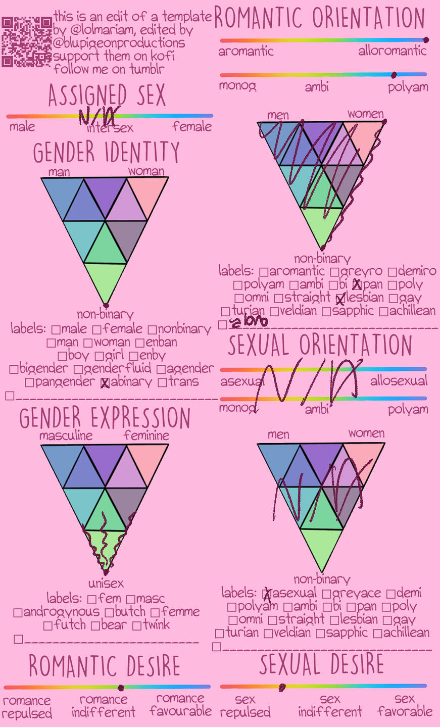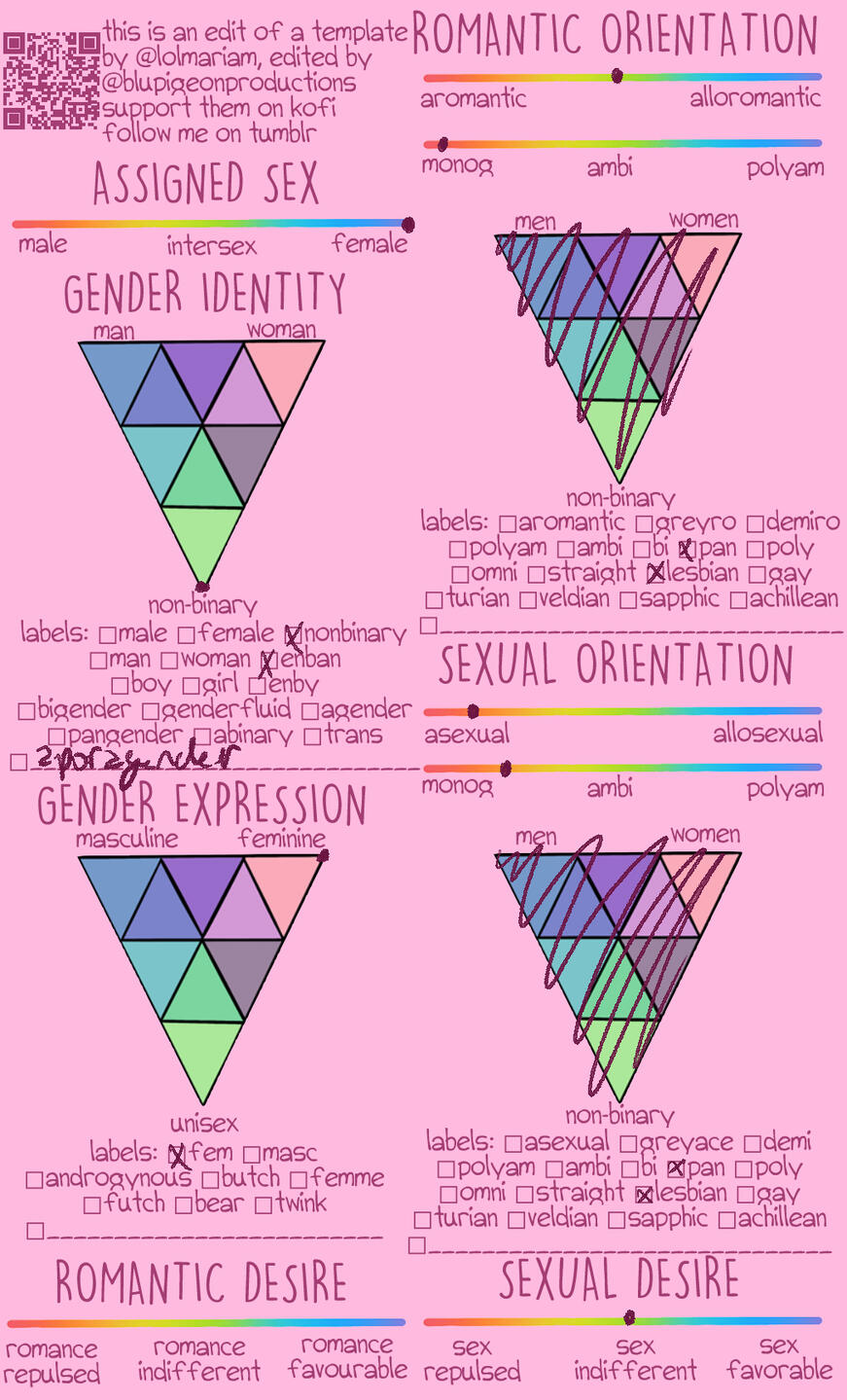 bigender, nonbinary, oriented aroace, abrosexual, polyamorous, pink lesbian, blue gay